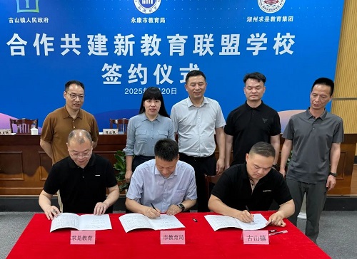 永康市教育局局长陈业根、古山镇党委副书记、镇长胡晓斌、湖州求是教育集团总校长张海明代表签约