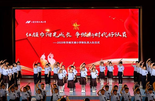 华维文澜小学大队长钱艺萌带领全体少先队员庄严宣誓,稚嫩坚定的声音穿透校园,入队誓词如灯塔照亮成长之路。新队员紧握胸前红领巾,诉说着入队的欣喜。
