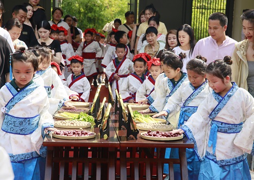 仪式伊始,孩子们身着汉服,在家长陪伴下,伴着声声鼓韵步入书院。他们依次抚过莲子、红豆等象征吉祥的物件,跨过状元桥、迈过启智门,开启求知之旅。