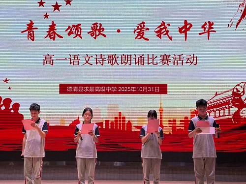 (通讯员 向文凯)10月31日下午,德清县求是高级中学报告厅内诗意流淌、青春飞扬。高一年级“青春颂歌·爱我中华”诗歌朗诵比赛在此隆重举行,20个班级的学子们以声传情,用诗歌抒发爱国情怀,用青春唱响时代强音。