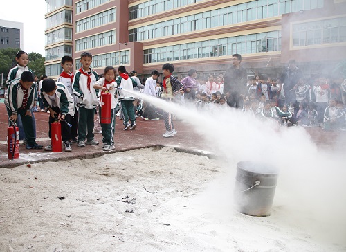 全体师生在操场上稍作休整后,在安全员丁老师和薛老师的指导下,学习灭火器的正确使用方法。
