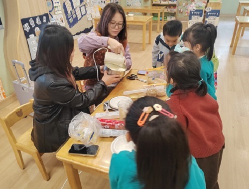 蔓蔓妈妈和Jojo妈妈带着丰富的食材走进教室,为孩子们带来了一场趣味十足的木糠杯制作活动。一层细腻饼干碎,一层绵密淡奶油,荣宝们专注投入,小手不停忙活,在妈妈助教的引导下认真学习分层搭配的技巧。当亲手制作的木糠杯完成时,孩子们迫不及待地品尝这份甜蜜,脸上洋溢着满满的成就感与幸福。