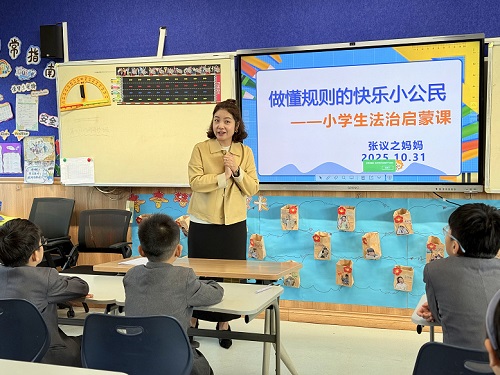 (通讯员 冯金娜)为进一步加强小学生的规则意识与法治观念,诸暨市海亮外国语学校小学部于近日举办了一场亲子课堂活动。本次活动特邀学生家长张议之妈妈,为孩子们带来了一堂以“做懂规则的快乐小公民”为主题的法治启蒙课,在轻松活泼的氛围中,为同学们播下了知法、守法的种子。