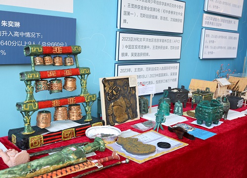 评审环节,评委从思想内容与主题契合度、艺术创意与整体美感、制作工艺与技术难度、绿色理念与解说表达等多个维度进行综合评分。展览期间,二楼大厅展区成为校园里一处独特的“微型博物馆”。一件件作品色彩贴切、比例到位:有的将甲骨文刻痕细致还原,有的精准呈现半地穴式房屋的结构特点,有的再现司母戊鼎的庄重厚重,有的用编钟模型敲响古乐的余音。这些生动的作品,承载着同学们对历史文物细节的观察、对地理环境规律的思考,更折射出他们对中华优秀传统文化的浓厚兴趣与真挚情感。