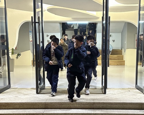 随着疏散警报响起,全体住校生用湿毛巾捂住口鼻,弯曲身体,排好队列,从各自宿舍内从低层到高层有序撤离,按照提前规定的合理逃生路线向安全区域转移。每层楼梯口及转弯处均有相应教师维持秩序、应急疏导。学生听从指挥,行动迅速,丝毫没有手忙脚乱的冲撞,也没有掉以轻心的玩闹。