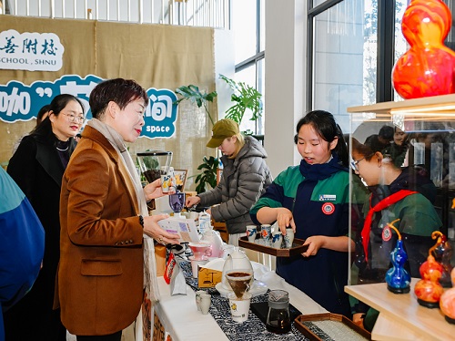 展区营造出咖啡香气与艺术气息交融的田园氛围。师生作品匠心独具,诠释了“传统与现代融合、动手与创意并举”的理念。互动环节中,学员现场演示手冲咖啡,将美学体验、工艺实践与生活礼仪自然融合,展现了美育向日常生活的渗透。