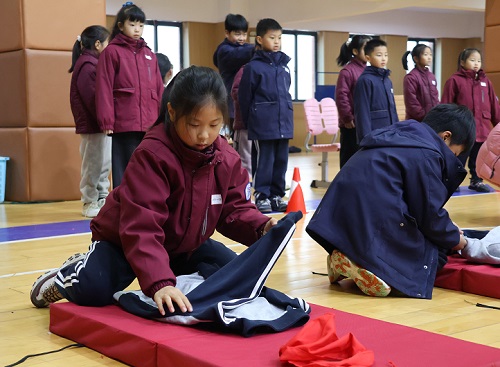 比赛按年级分层设计,项目贴近生活、注重实用:一年级小朋友挑战叠袜子、整理书包、剥毛豆;二三年级学生比拼系红领巾、系鞋带、土豆削皮;四五年级的同学则需完成穿针引线、切土豆丝等更高难度的任务。现场每一位小选手都全神贯注,动作虽显稚嫩却异常认真,在叠放衣物、挽跳绳、整理书包等环节中展现出平日训练的扎实成果。