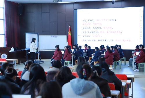 活动在学校阶梯教室举行,全体学科教师齐聚一堂,共同观摩与研讨。上午的课堂展示率先掀起了思维热潮。何丹平老师执教的语文课《古人谈读书》,引导学生在古今对话中感悟学习之道;何丽银老师带来的数学课《植树问题》,借助生动的模型与小组合作,巧妙化解思维难点,充分体现了“创思课堂”以问题驱动思考的核心。两节课均深度融合了平板与AI技术,实现了实时互动、精准的学情反馈与个性化学习路径支持,将科技感与教学智慧有机结合,让学习真正告别枯燥灌输,走向主动探索与深度建构。