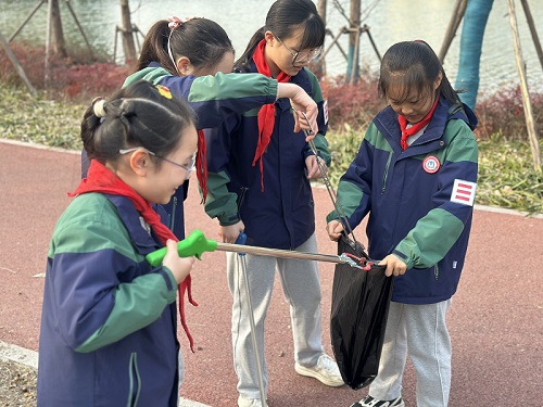 少先队大队委组建“红领巾社区志愿服务小队”走进社区。孩子们参与了垃圾分类知识小课堂,学习区分可回收物、有害垃圾等知识。随后,大家制作爱护绿化宣传牌,走进社区绿道,将宣传牌悬挂在树枝上、插在草坪边。最后,孩子们戴上手套,沿路拾捡纸屑、烟头等垃圾。一个个弯腰忙碌的身影,赢得了过往居民纷纷点赞。