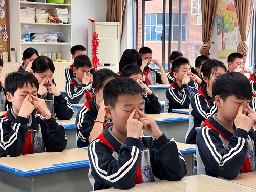 比赛现场,气氛严肃而有序。当熟悉的眼保健操音乐在校园内响起,各班学生迅速端坐,凝神静气,进入状态。从预备姿势到“按揉攒竹穴”、“挤按睛明穴”、“揉四白穴”、“轮刮眼眶”等各个节拍,同学们神情专注,动作整齐划一,努力做到穴位精准、力度适中、节奏合拍,展现出日常训练的扎实功底和良好的精神风貌。